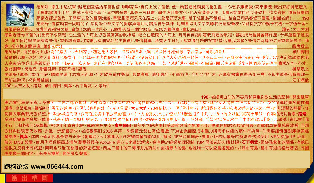 【5】.敬愛的老總,你好!本人看貴報也好幾年了,也算是個忠實的粉絲,但就從來沒有親自給你老大家寫過一封信,也不知道是不是真的有信箱存在。所以今次決定試試給你老人家去信並送上最親切的問候。因為第一次去信,期盼有機會登報山以解我心中疑惑。正如老總所説,不問肖,不問碼,開話家常最重要。這個願望是否能實現?本人不才,就此擱筆。祝老總:身體健康、閔家幸福!讀者 楓莱敬上